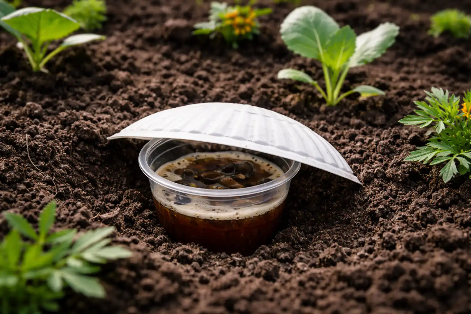 • Kaevake väikesed plasttopsid maapinnaga tasa. • Täida need kolmandiku ulatuses tumeda õlle või vee, pärmi ja suhkru seguga. • Katke pealmine pool ühekordse plaadiga, et vihma ei satuks. • Kontrollige ja puhastage konteinereid igal hommikul.