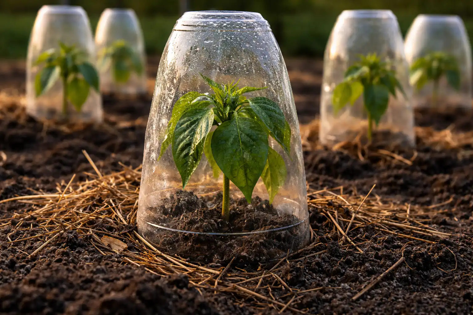 Salanüanss: kui paprika hakkab kohe pärast istutamist närbuma, katke iga taim kaheks-kolmeks päevaks tavalise paberkorgi või äralõigatud kaaneta plastpudeliga. See loob kõrge õhuniiskusega mikrokliima ja vähendab juurte kohanemise ajal lehtede kaudu aurustumist.