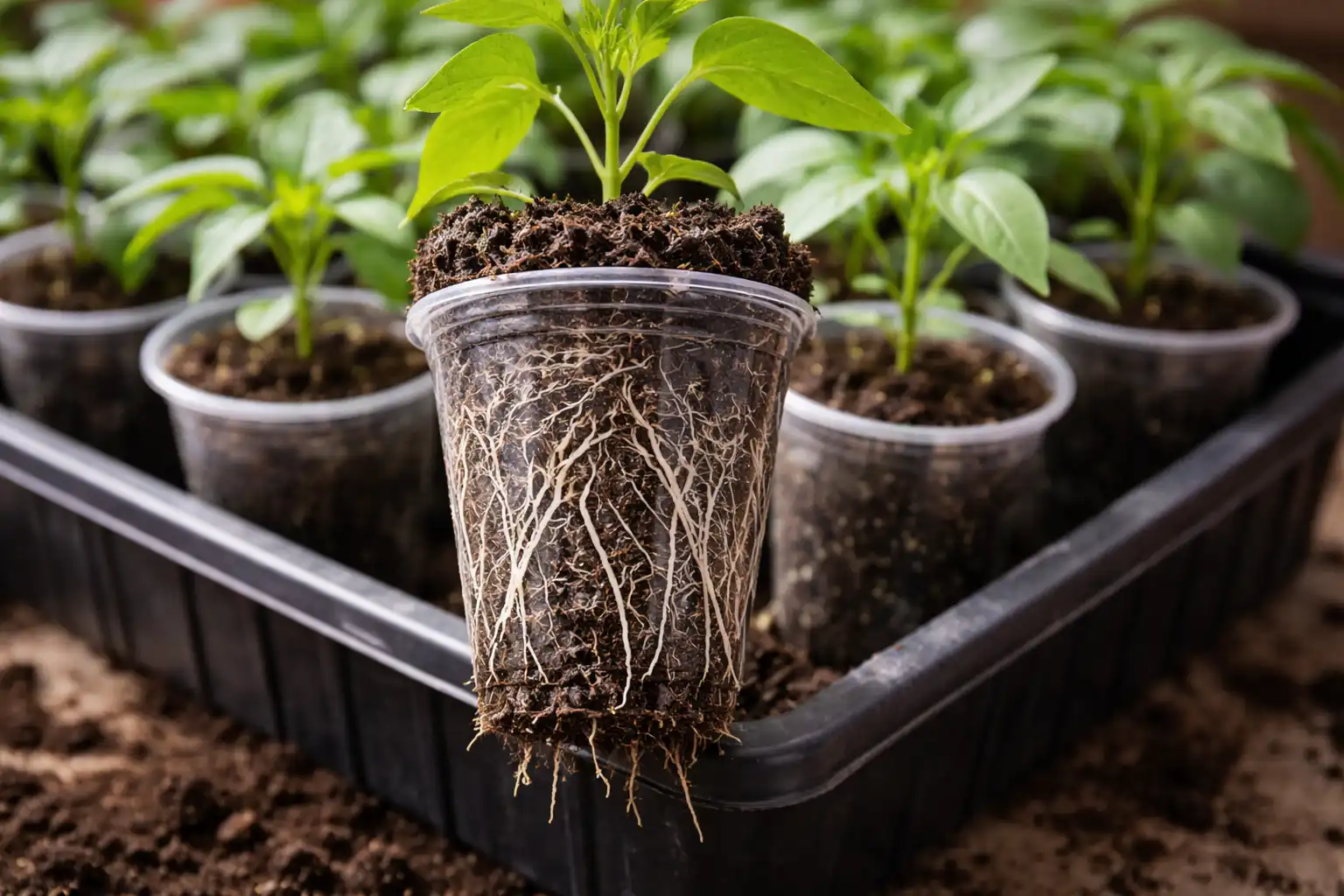 Kui seemik on piiratud mahus, jõuavad selle juured kiiresti seinteni. See annab taimele signaali: “Koht on välja arendatud, on aeg rohelist massi suurendada.” Suures potis kulutab paprika kogu oma jõu, püüdes juurtega äärteni jõuda, samal ajal kui keskel olev arenemata pinnas hakkab mädanema.