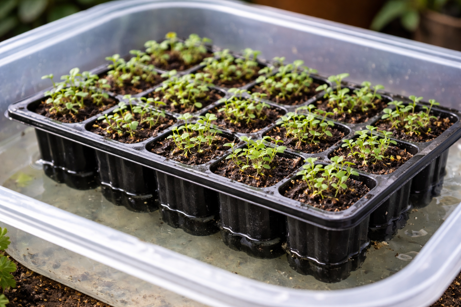 Et vältida “musta jalga” ja samaaegset kuivamist, kasutan taktikat põhja kastmine. Vesi läheb otse juurtele ja mullapind jääb parasniiskeks, mis takistab seente arenemist.