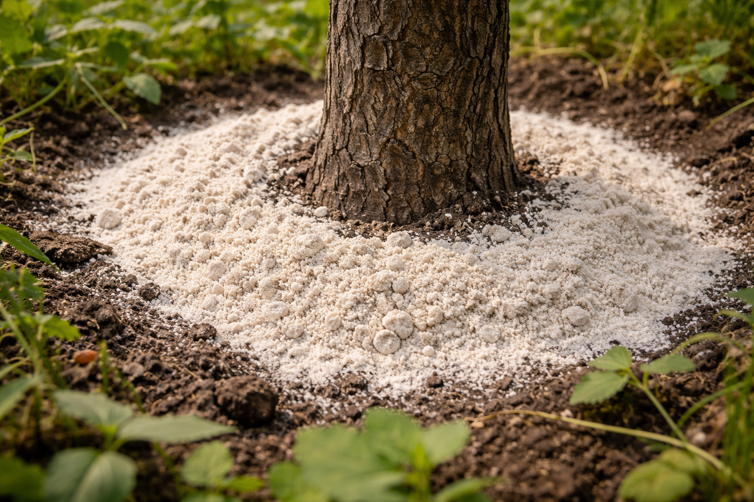 Lisaks deoksüdatsioonile võitleb see mineraal tõhusalt mõnede mullakahjurite vastu. Väikesed jahuosakesed hävitavad kitiinsed katted traatuss ja ploomipuu all talvituvad putukate vastsed. See on suurepärane võimalus ühendada puude toitmine ja aia pehme bioloogiline kaitse ilma tugevatoimelisi kemikaale kasutamata.