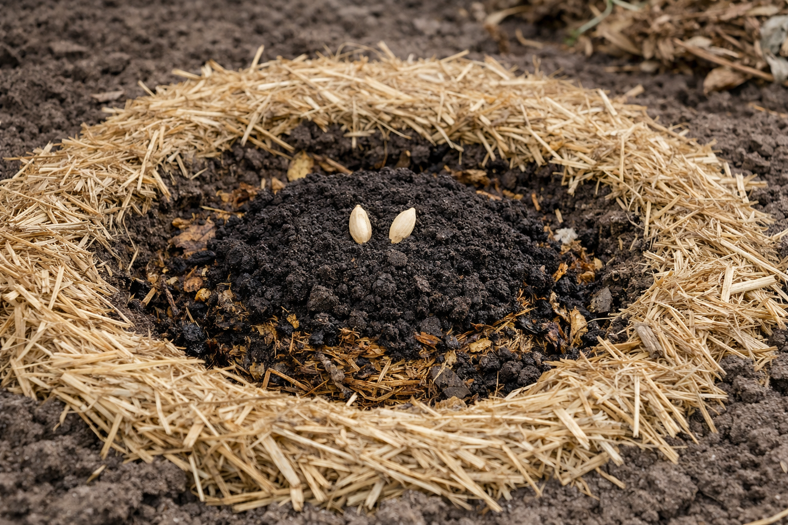 Et seemned maikuus ära ei külmuks, kasutan lokaalset kuumutusmeetodit. Iga augu alla kaevatakse 40 cm sügavune auk, kuhu see laotakse orgaanika (niidetud muru, eelmise aasta lehed). Lagunedes eraldab see soojust, tekitades altpoolt soojendava efekti.