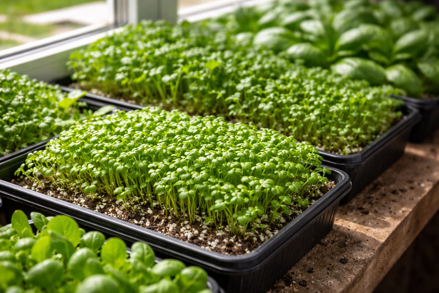 Kiire alguse saladus on õigete seemnete valimine. Te ei tohiks kohe võtta kapriisseid taimi; parem on eelistada põllukultuure, mis andestavad algajate vead. Nad näitavad end hästi vesikress, lehtsinepit Ja rukola. Neil on kõrge idanemisenergia ja nad moodustavad paksu pea juba varases staadiumis.