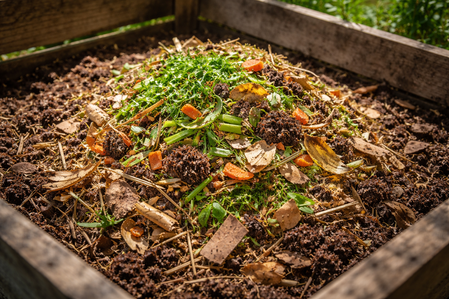 Piisab värskete köögijäätmete pealmise kihi täielikust piserdamisest väikese koguse tavalise mulla või kuivade sügislehtedega.